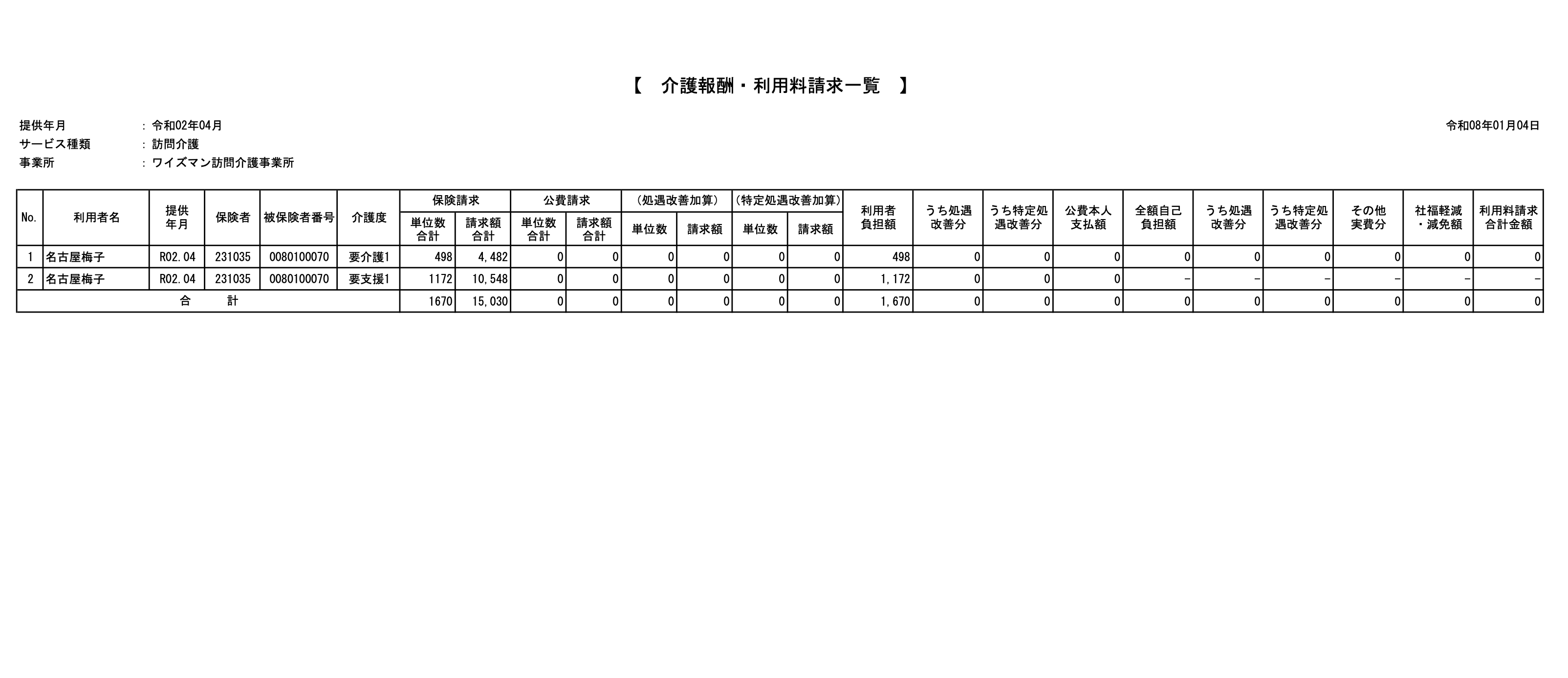※同一事業所番号で複数の総合事業サービスを実施される事業所様の場合、総合事業費明細書(様式第二の三)および総合事業費請求書(様式第一の二)は総合事業サービス毎に分かれて出力されます。
