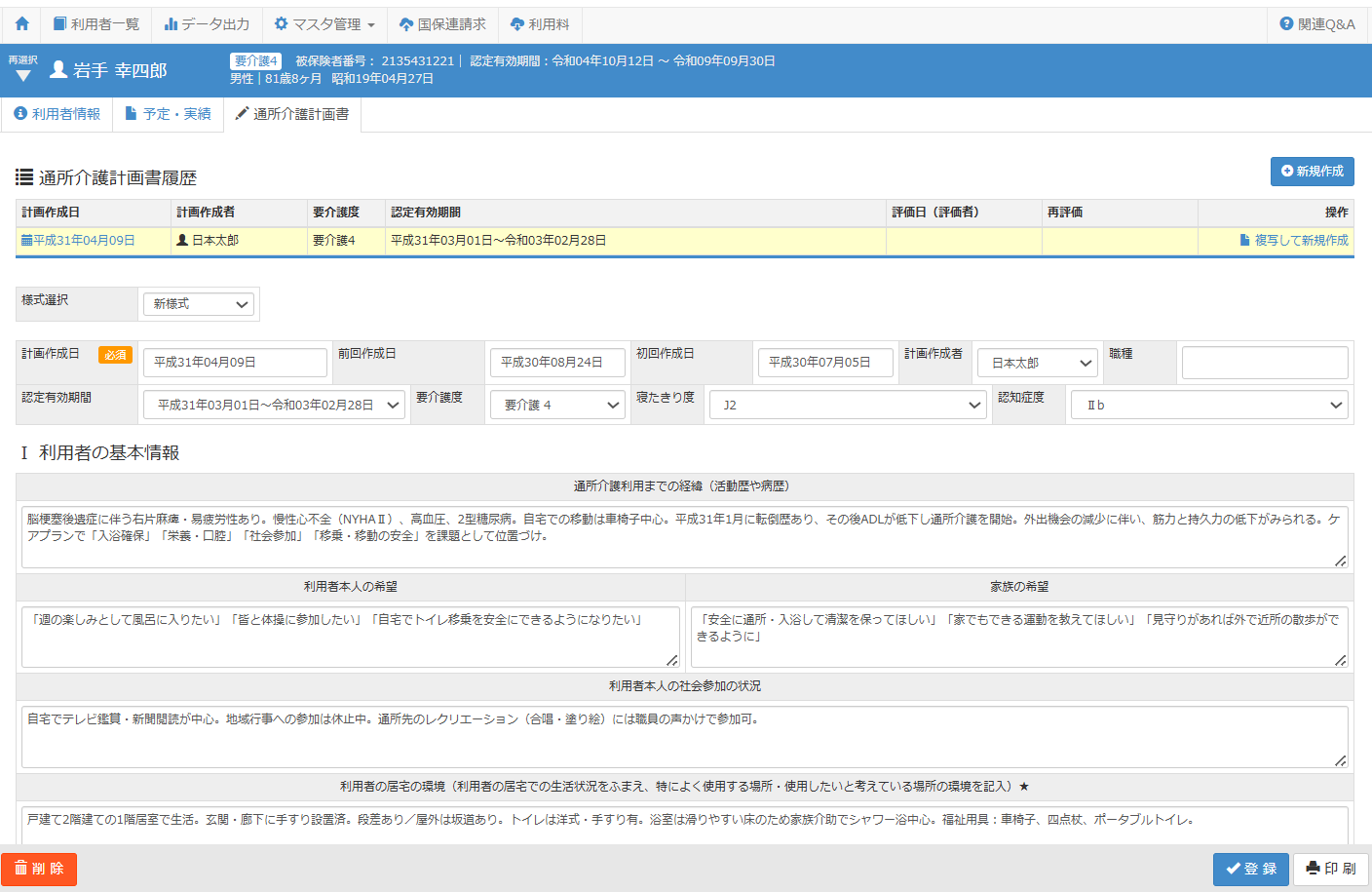 居宅サービス計画書、予防サービス計画書(厚労省版)、週間計画を履歴で管理。過去分を複写する機能もあり、計画を見直す際も簡単に作成できます。
